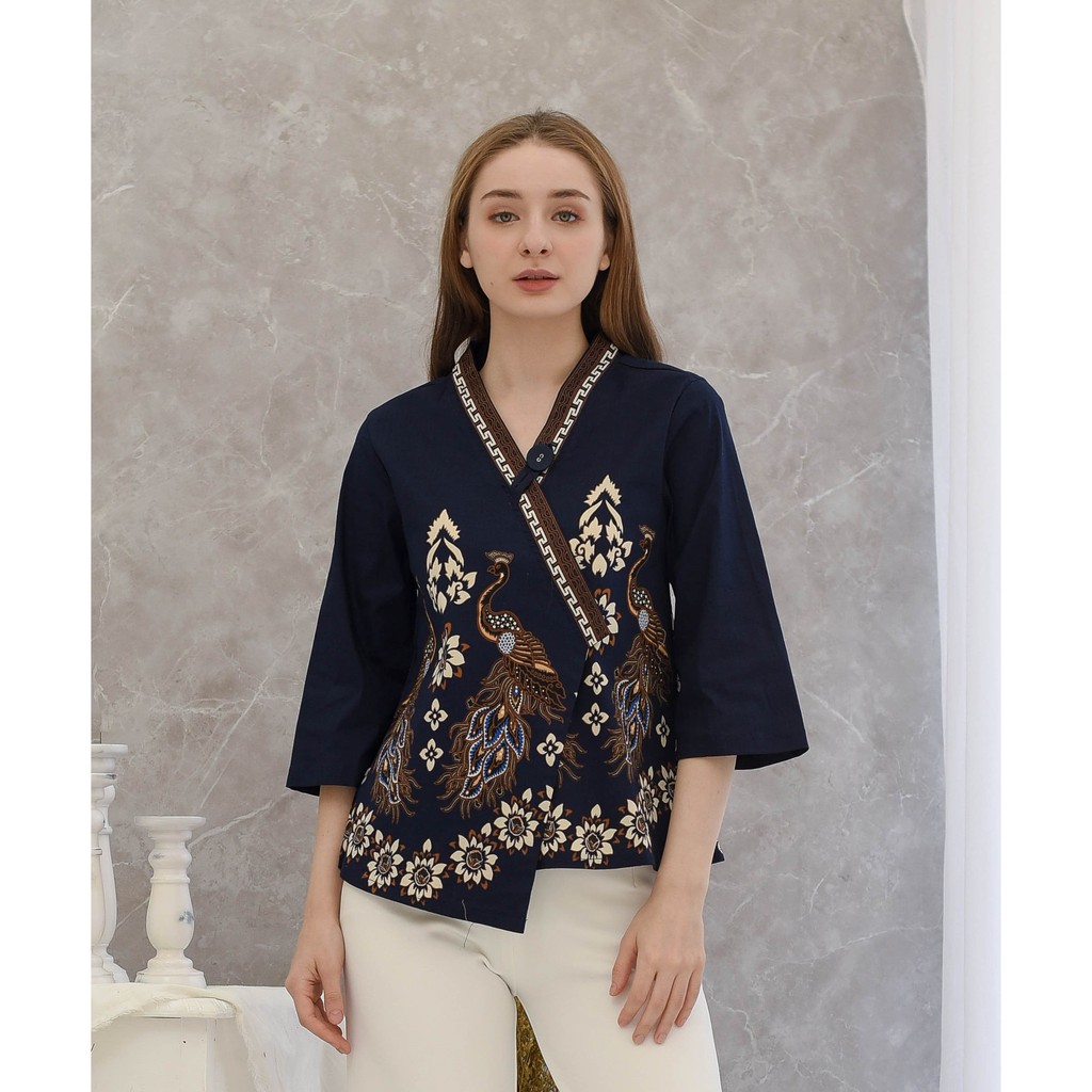 Atasan Batik Wanita model Kimono lengan panjang dengan aksen PEACOCK (burung merak) yang megah memberikan kesan elegan.